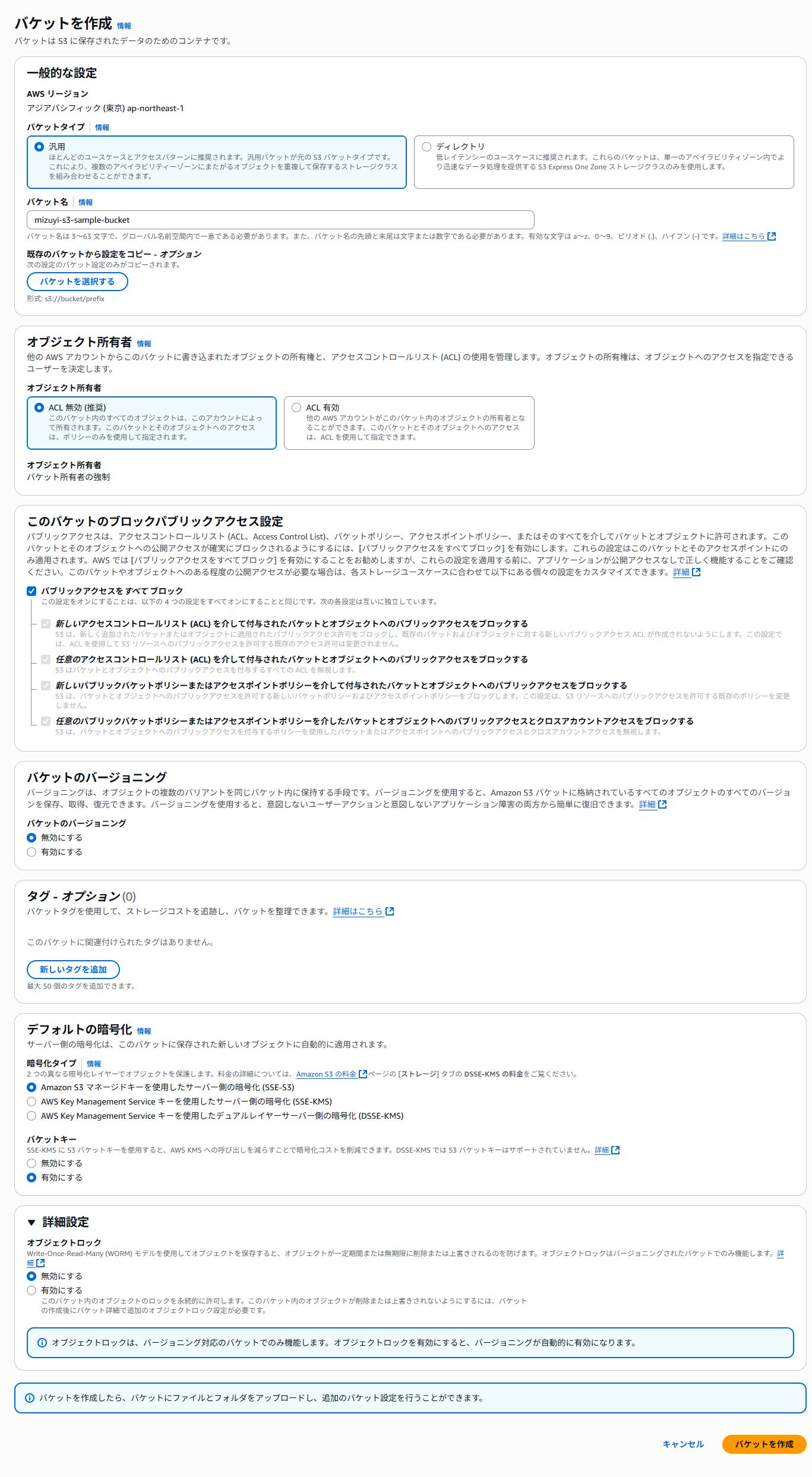 | 暗号化タイプ | Amazon S3 マネージドキーを使用したサーバー側の暗号化 (SSE-S3) |