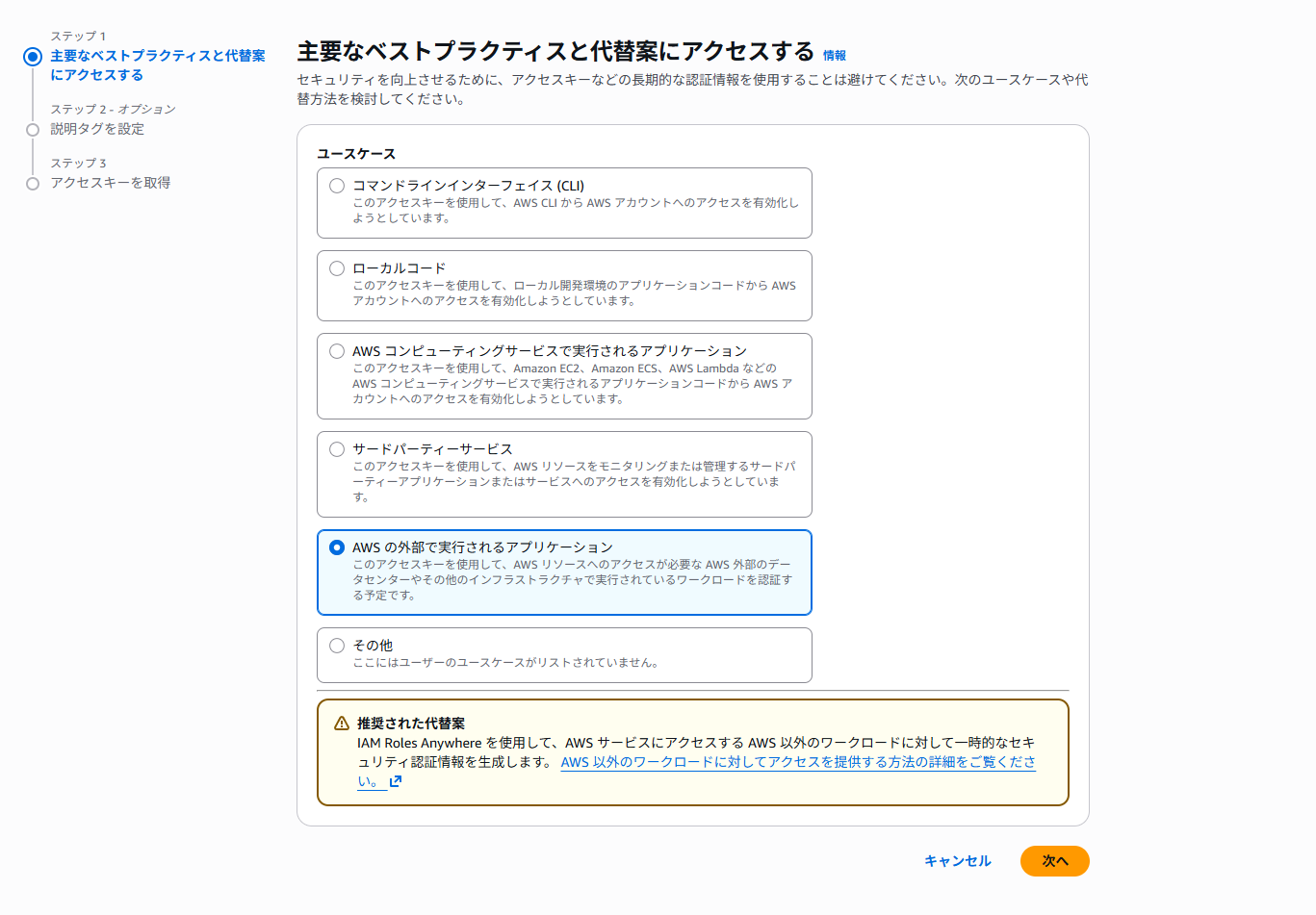 ユースケースはAWSの外部で実行されるアプリケーションを選択