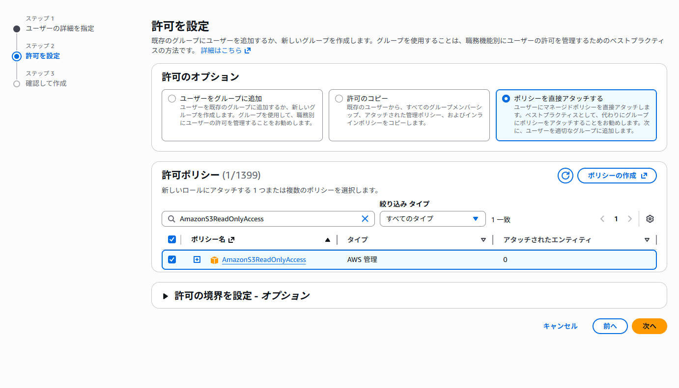 AmazonS3ReadOnlyAccessポリシーが許可されたアカウントを作成。
